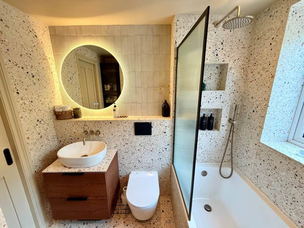 • Stunning Bathroom – The shower is above the bath, giving you the option for both. The light up mirror gives you the option to listing to music or podcasts, etc whilst washing, with Bluetooth.Â